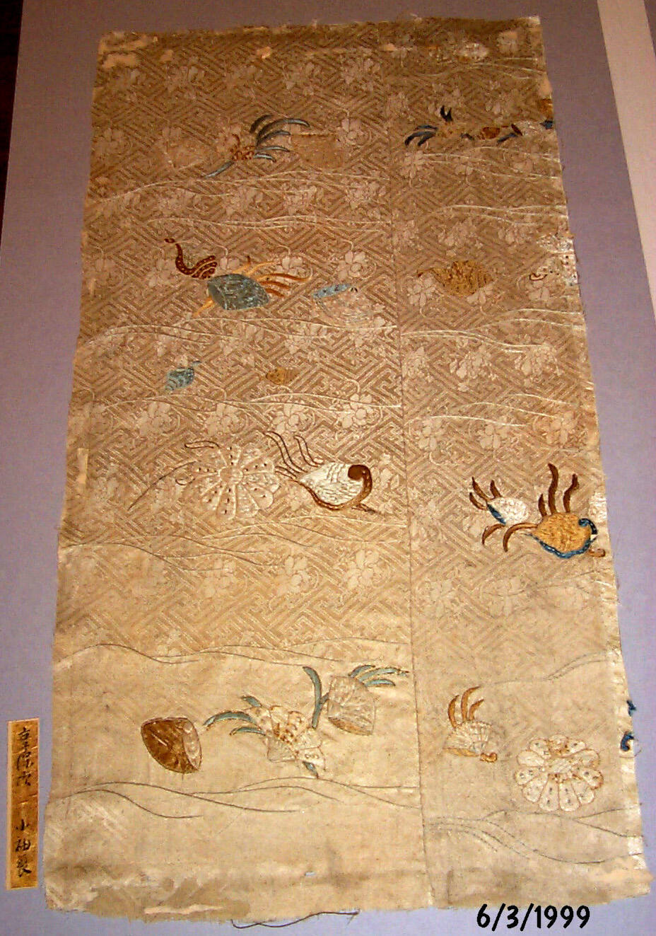 DescriptionWhite Chinese figured satin ground with silk and metallic thread embroidery. Mirugai (shell and seaweed) pattern.