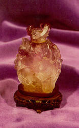 DescriptionEgg-shaped amethyst bottle carved in high relief with a flower, pine tree and bird design, matching stopper.