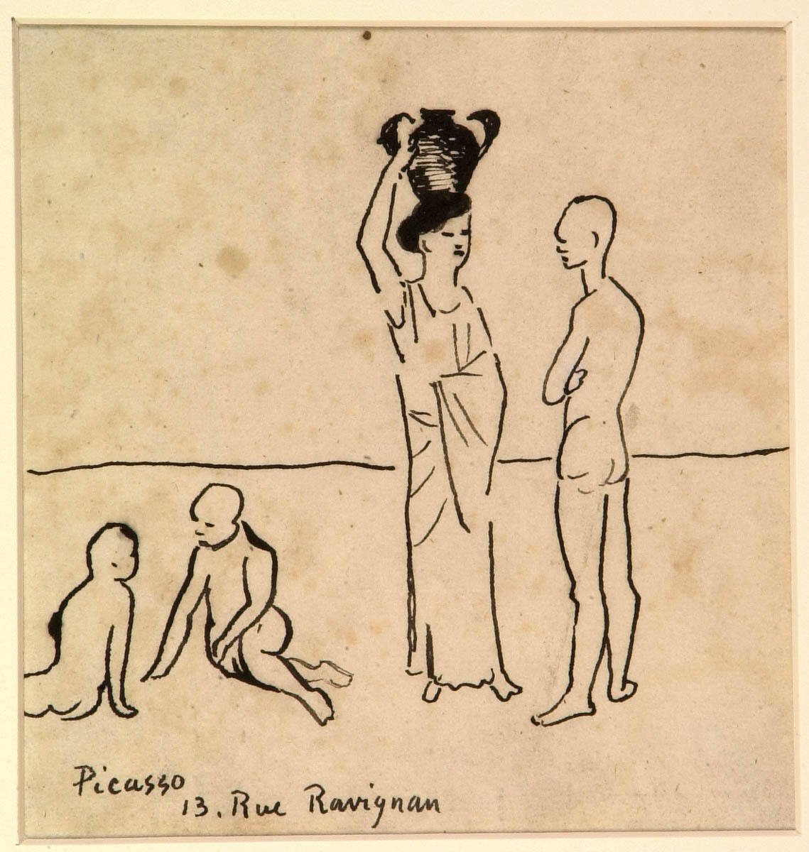 With simple, flowing lines Picasso animates the figures of two children and the conversation between a man and a woman. He made this little drawing soon after his arrival in Paris. At that time, Picasso lived in a decrepit studio building at 13, Rue Ravignan, the address indicated here. The building, nicknamed Le Bateau-Lavoir (laundry barge), for the way it creaked and swayed on stormy days, would later be home to other young, impoverished artists arriving in Paris.