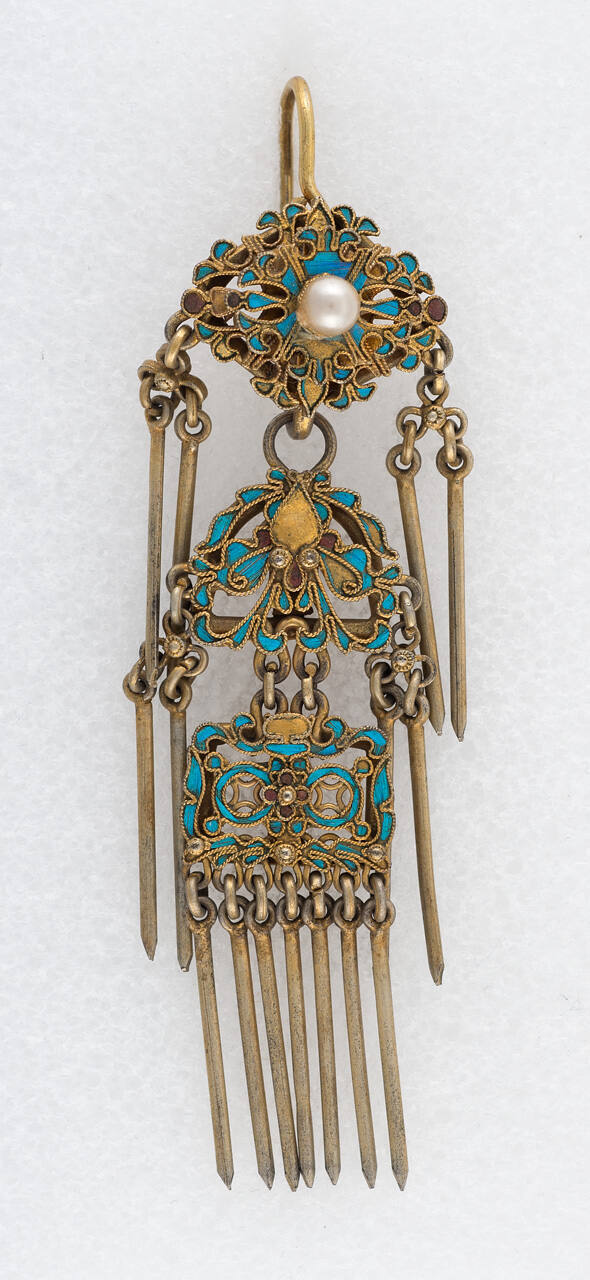 DescriptionKingfisher feather enamel on silver gilt dangles of wire