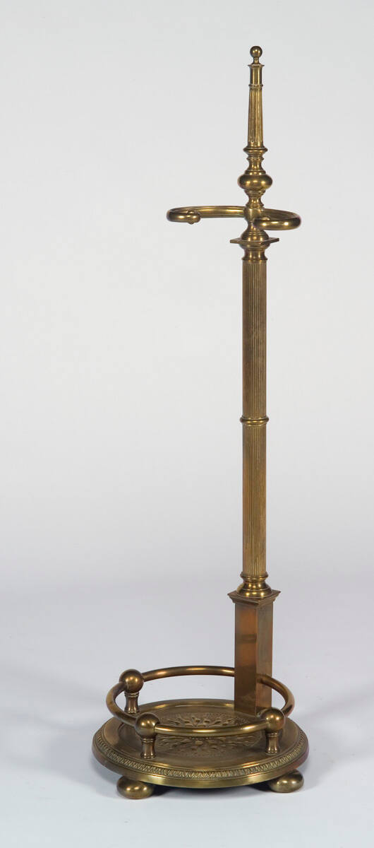 DescriptionRound brass stand, flat plate at bottom, round hoop at top to hold poker, tongs and fire shovel.ProvenanceProbably William Rockhill Nelson (1841-1915), Oak Hall, Kansas City, MO, by 1915 [1];