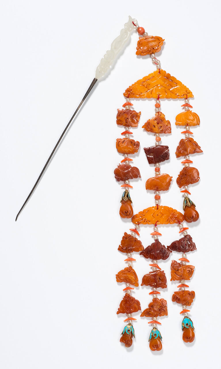 A close look reveals exquisite details. A pair of hairpins includes carved amber fishes, horses, coins and melons. Made up of many jewels, a pair of earrings features phoenixes pecking at a pearl pendant.