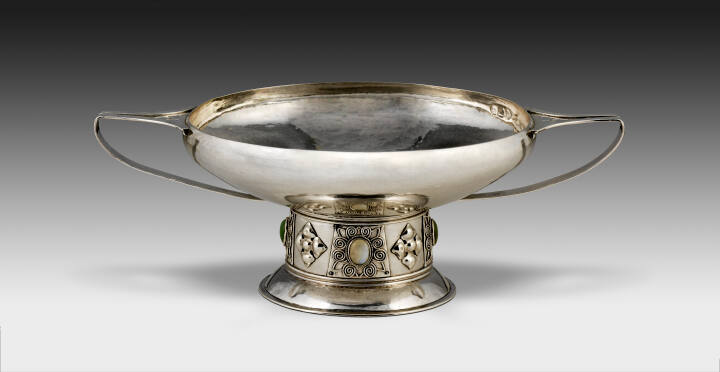 DescriptionTwo-handled, footed dish, the waist of the base set with mother-of-pearl and with wirework decoration and the handles pierced with a trefoil design.Gallery LabelThis gracefully proportioned dish exemplifies the aesthetics, design and production methods of the English Arts and Crafts Movement. The dish's Celtic-inspired panels of scrolling silver wire, punctuated by inset semi-precious stones, exemplify the simple, yet elegant, forms of the Movement. The designer Richard George Hatton balanced the dish's decorative flourishes with the polished body of the dish and the sweeping curve of the looped handles. The manufacturer, Newcastle Handicrafts Company, typified the small craft guilds that sought to improve everyday life through beautiful and superbly crafted functional objects.