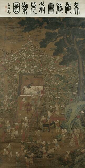 Gallery LabelThis image of infant boys expresses the common wish in Chinese culture to bear male descendants. These well-fed, plump boys would have been born and raised in a wealthy family. The glowing garden—featuring a canopy of blossoms and ripened peaches and a pair of mandarin ducks on the pond—flaunts the family’s wealth and fertility.