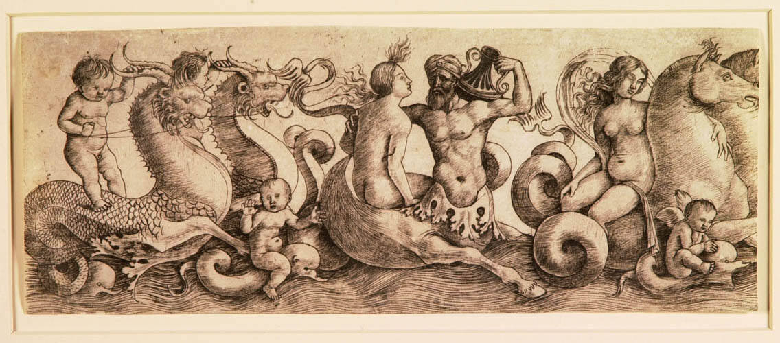 In this scene, the cavorting figures of little boys represent the souls of the departed accompanied by nymphs, Tritons, sea horses, dolphins and sea centaurs. The subject may derive from classical sarcophagi or mosaics, which often represented fictitious marine creatures derived from Greek and Roman mythology. This print is an experimental proof made as a trial run by the artist. This would then be followed by a first state, that version of the print sanctioned by the artist for public sale.