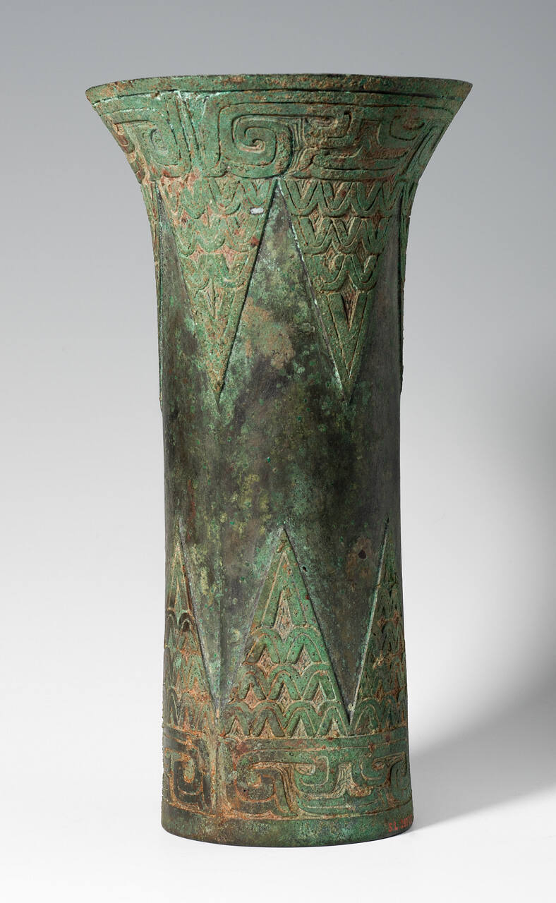 DescriptionDecorated at the top and bottom with a band of an abstract pattern from which extend triangles enclosing a scale pattern in saw tooth arrangement over body. Flared opening at one end; other end, similarly flared, is filled in with a bronze disk of modern work. Was originally open at both ends.