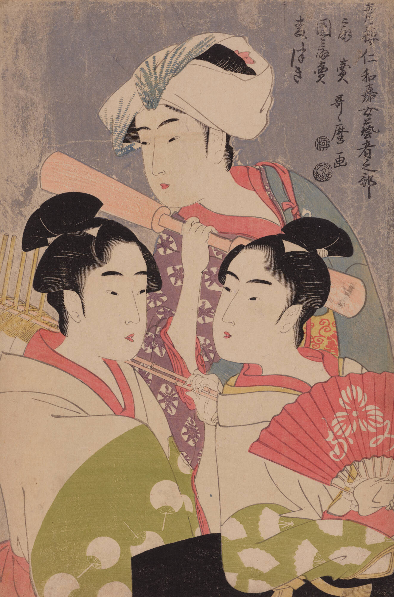 An important artist of Ukyio-e, Kitagawa Utamaro was celebrated for his images of beautiful women, both geisha (courtesan) and ordinary women. His favorites are these sensual, slender beauties engaging in everyday activities.