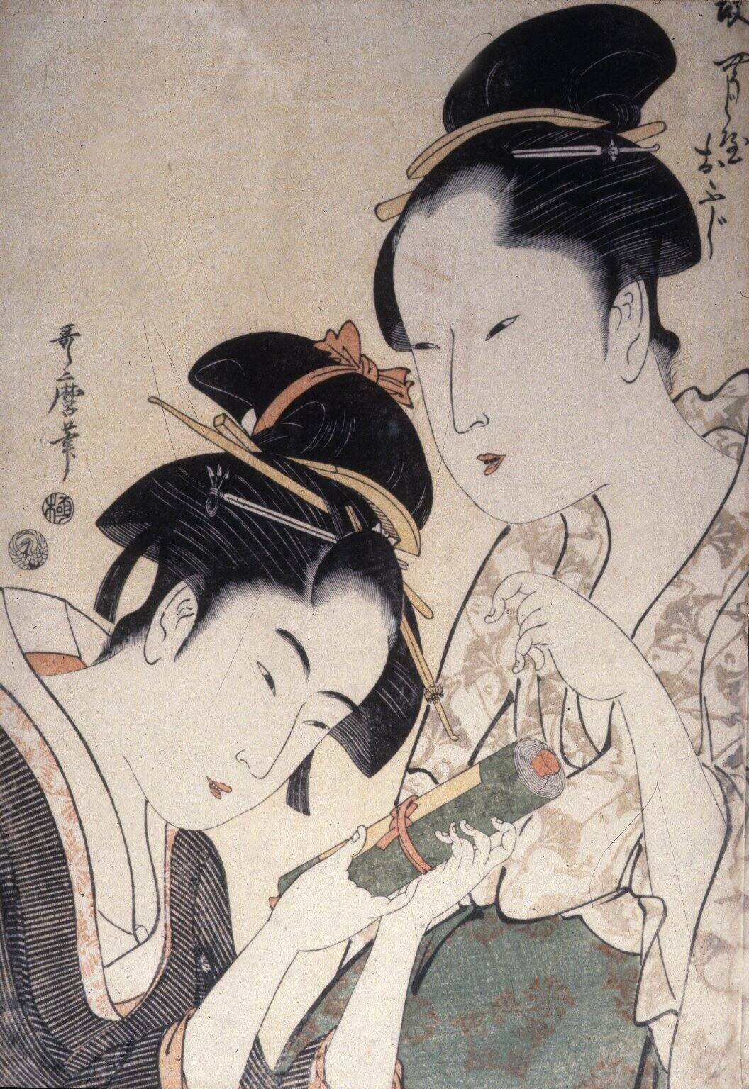 An important artist of Ukyio-e, Kitagawa Utamaro was celebrated for his images of beautiful women, both geisha (courtesan) and ordinary women. His favorites are these sensual, slender beauties engaging in everyday activities.