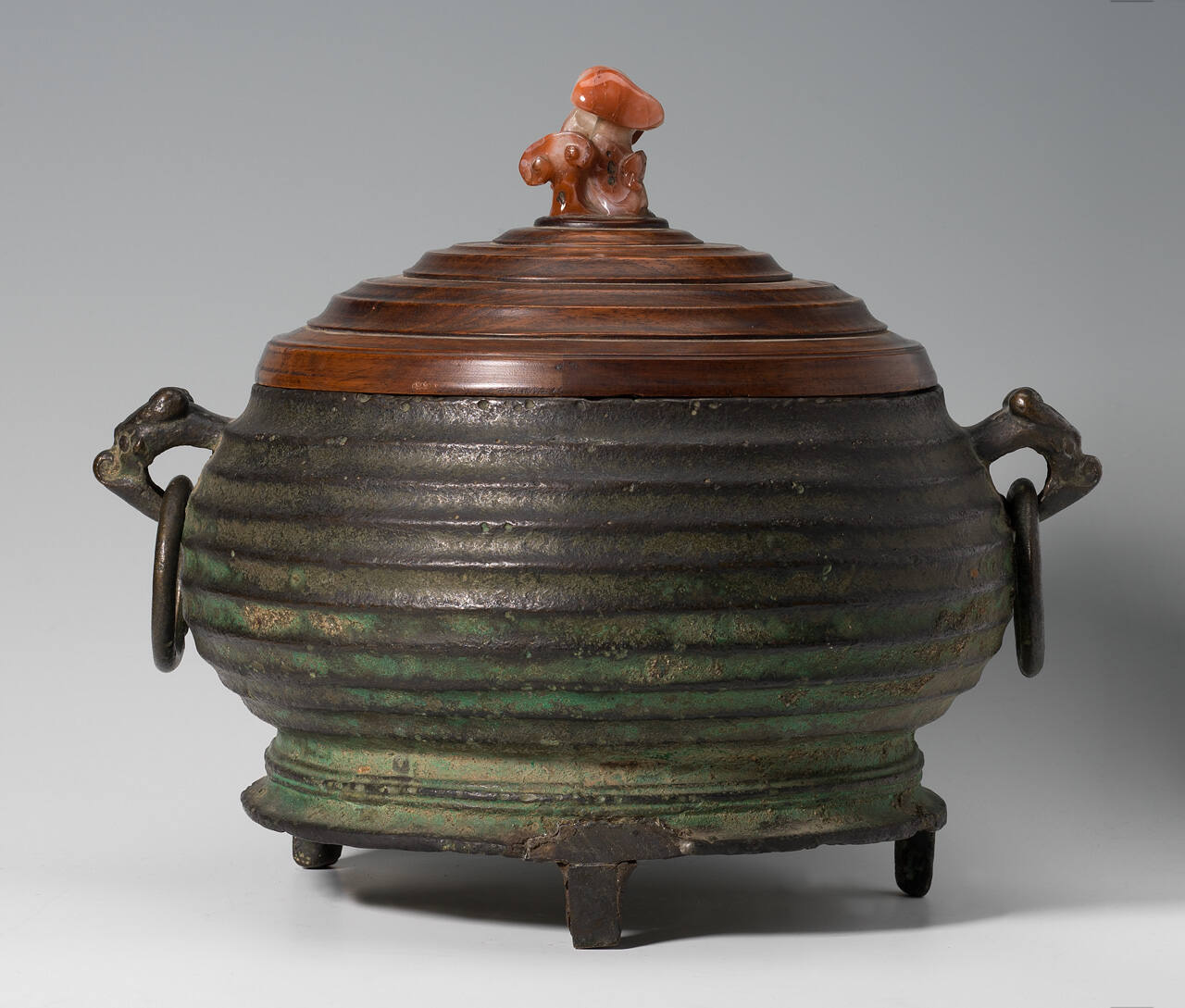 DescriptionRibs in concentric circles decorate body of vessel; loop handles pendant from t'ao-t'ieh masks. Wooden lid with ju-i finial (later addition).