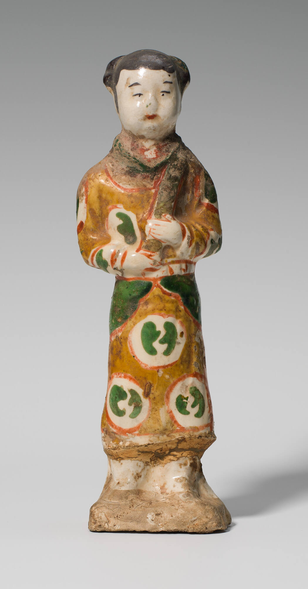 DescriptionFigurine of a female holding a musical instrument (?), wearing a yellow robe decorated with circles of green, red and white.