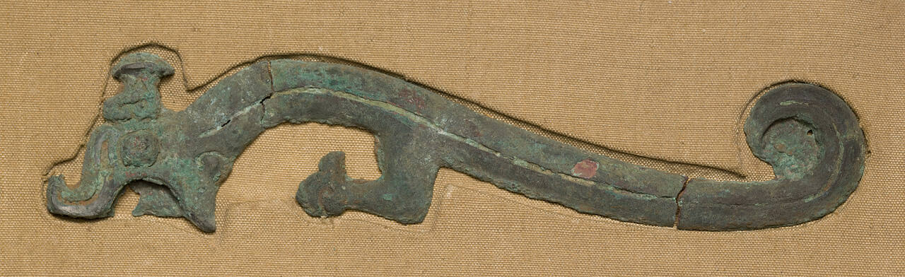 DescriptionHarness or chariot decoration. Formalized dragon, seen in full side view. Line down center of dragon. Green patina.ProvenanceT'ang Hsiao Wu, Peiping (modern-day Beijing), China, by March 30, 1934;