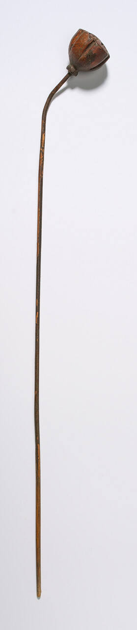 DescriptionLong stemmed seed pod with a curved stem, carved out of wood in a red-brown color.