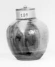 DescriptionA jar-shaped tea caddy of fawn clay covered with a creamy white finely crackled glaze with splashes of light brown. With a lid.