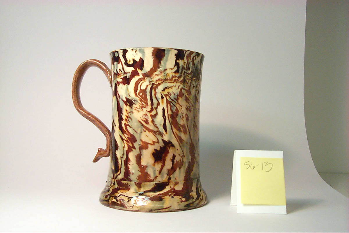 DescriptionSlightly spreading cylindrical body veined in dark brown, cream, gray and black glazes reaching to the reinforced spreading base. Ribbed handle.