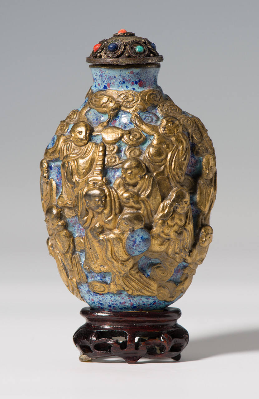 DescriptionThe ovoid body molded with the Eighteen Lohans in gilt against a robin's-egg ground.