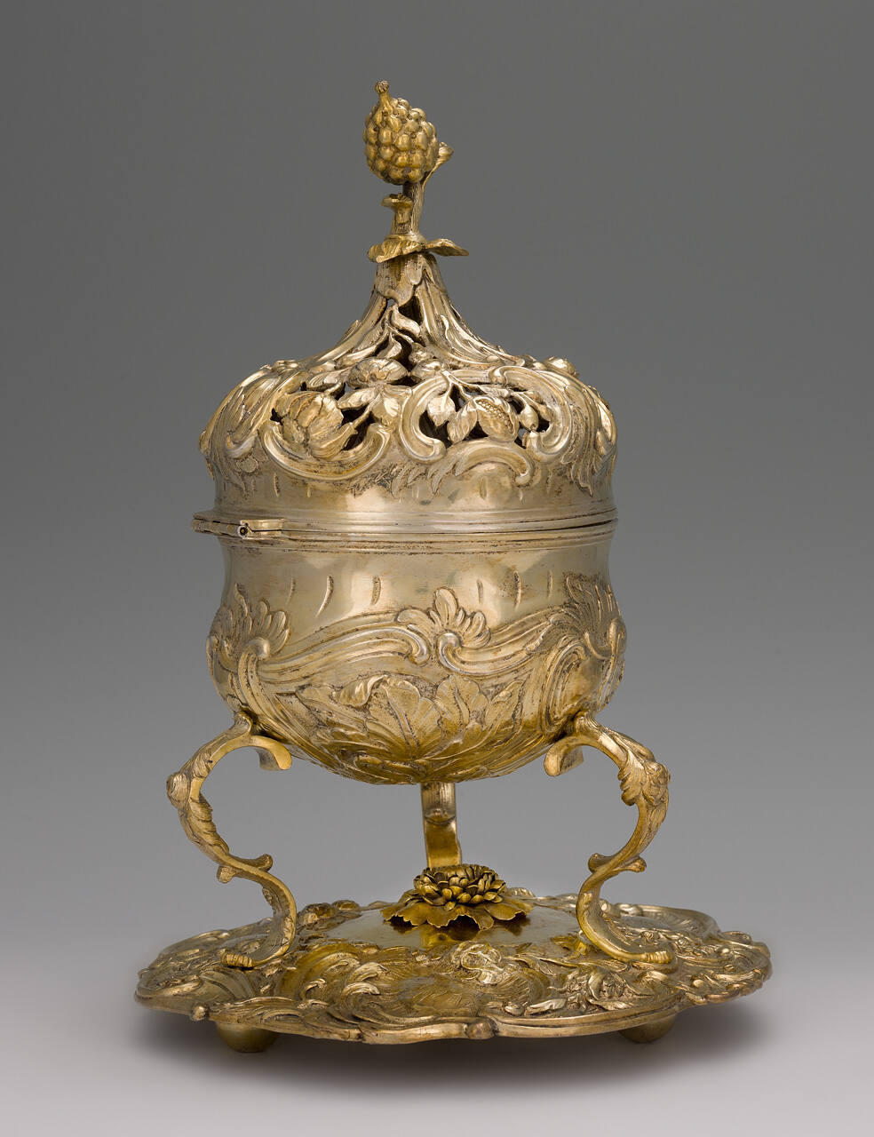 DescriptionSmall semi-globular form with hinged, clasped cover bearing scroll, floral and fruit designs amid piercings, ascending, above 3 leaves, to stemmed pineapple knop. Bottom supported by 3 legs of superposed double-C shapes standing on scalloped, round base having rosette in high releft at c., flowers and scrolls on shoulder, 3 cartouches with engraved designs. Flax or hair lining inside box.