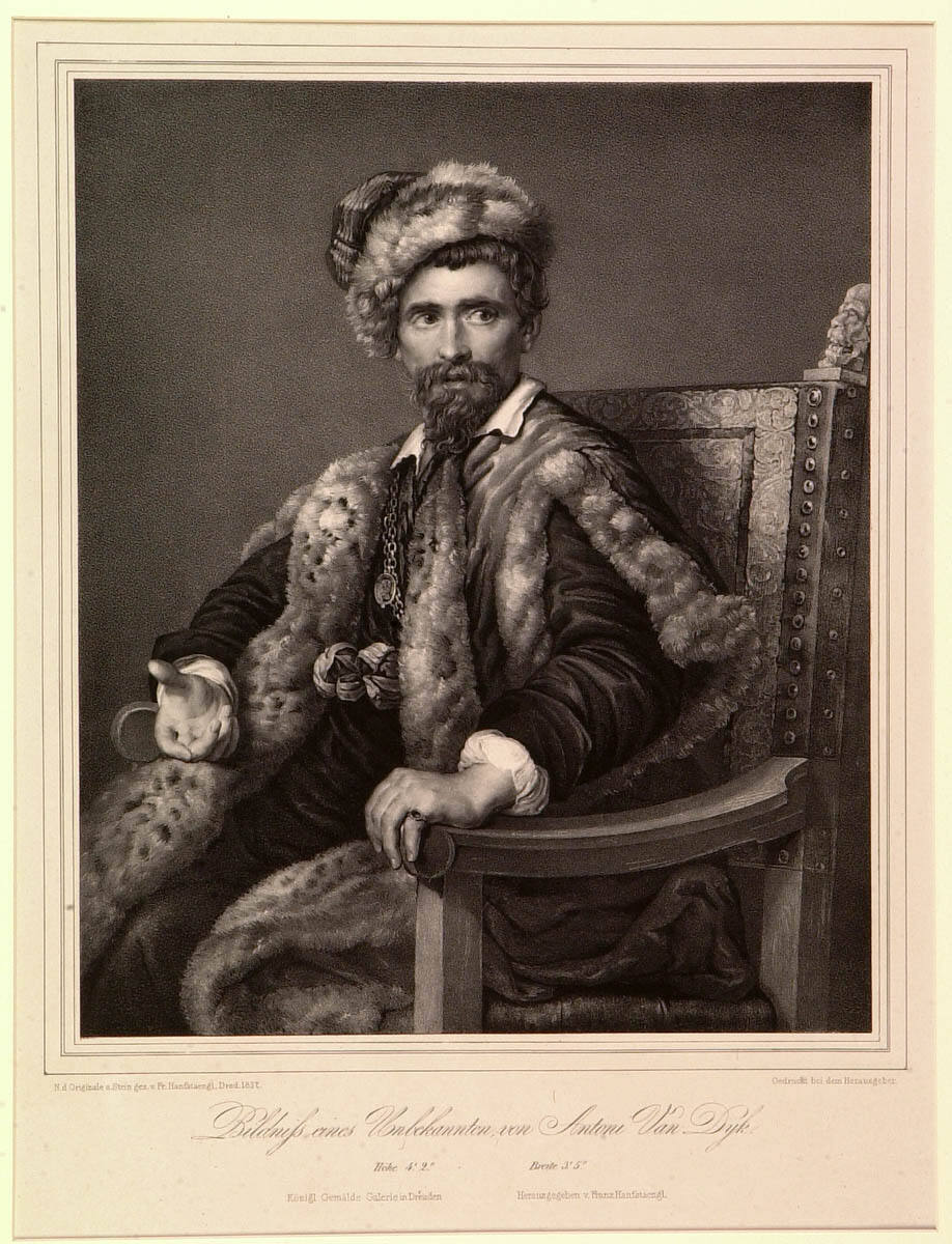 Purchased from Alden Galleries by The Nelson-Atkins Museum of Art, 1933.Die Vorzüglichsten Gemälde Der Königlichen Galerie In Dresden nach Den Originalen Auf Stein Gezeichnet. Nebst Erklärungen In Historischer Und Artistischer Hinsicht In Deutscher Und Französischer Sprache Von G.J.A. Frenzel, Vorsteher Der Königl. Galerie Der Kupferstiche und Handzeichnungen Zu Dresden, Ehrenmitglied Der Kaiserl. Academie Der Künste Zu St. Petersburg Herausgegeben Von Franz Hanfstaengl. / Les Principaux Tableaux De La Galerie Royale De Dresde Lithographiés D’Après Les Originaux. Avec Des Explications Historiques Et Concernant L’Art, En Allemand Et En Français Par J.G.A. Frenzel, Conservateur Du Cabinet D’Estampes De S.M. Le Roi De Saxe, Membre Honoraire De L’Académie Impériale Des Beaux Arts De St. Petersburg. Publies Par François Hanfstaengl (Dresden, 1836–1843). George L. McKenna, Prints, 1460–1995 (Kansas City, MO: Nelson-Atkins Museum of Art, 1996), 302, as after Anthony Van Dyck, Portrait