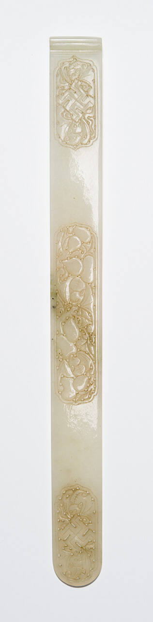 DescriptionLong, flat carved and pierced white jade hair ornament.