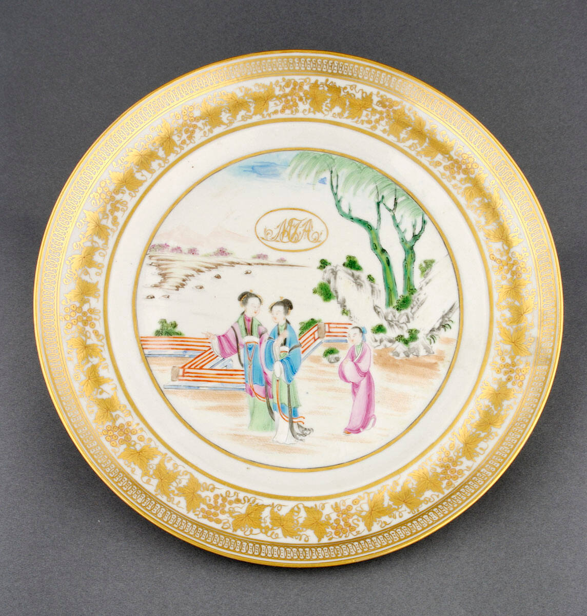 DescriptionPart of seventy-seven piece tea service. In plates and on sides of vessels and containers is scene in famille-rose style with gold monogram, MTA, above figs. Border design of gold grape bunches and leaves in plates and on lids and upper sides of vessels. Lid knobs of jam dish and pots, gold berries. Handles of truncated conical pots and cylindrical sugar, entertwining "vines" ends of which attached with gold leaves.