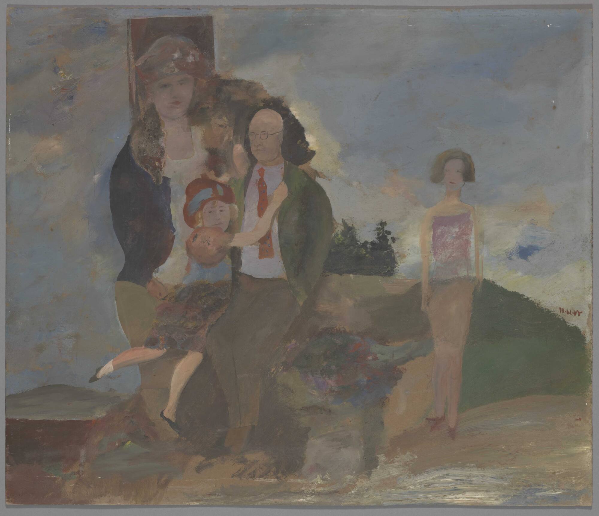 DescriptionGroup of three figures at left; man, woman, and young girl; standing figure of young woman, left; landscape background.