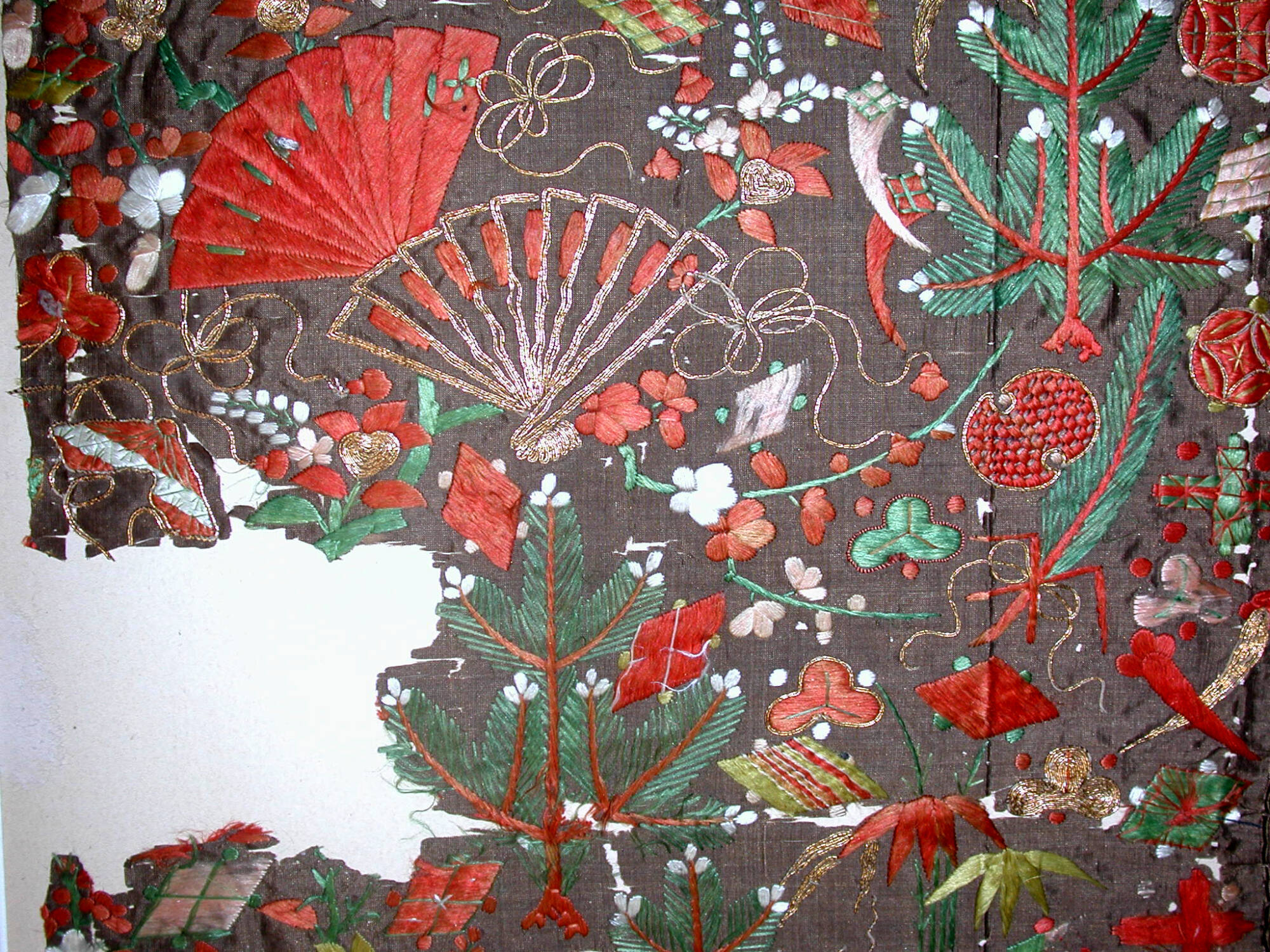MediumBrown nerinuki (unglossed silk) plain weave silk ground with silk and gold thread embroidery