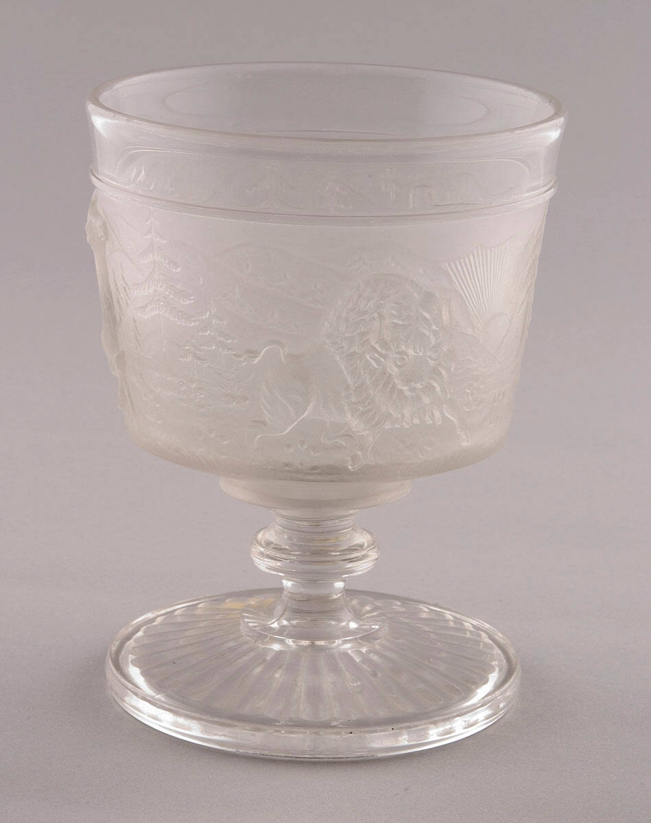 DescriptionDecorative band with pressed frosted glass, log cabin, buffalo and reindeer against Rocky Mountain background.