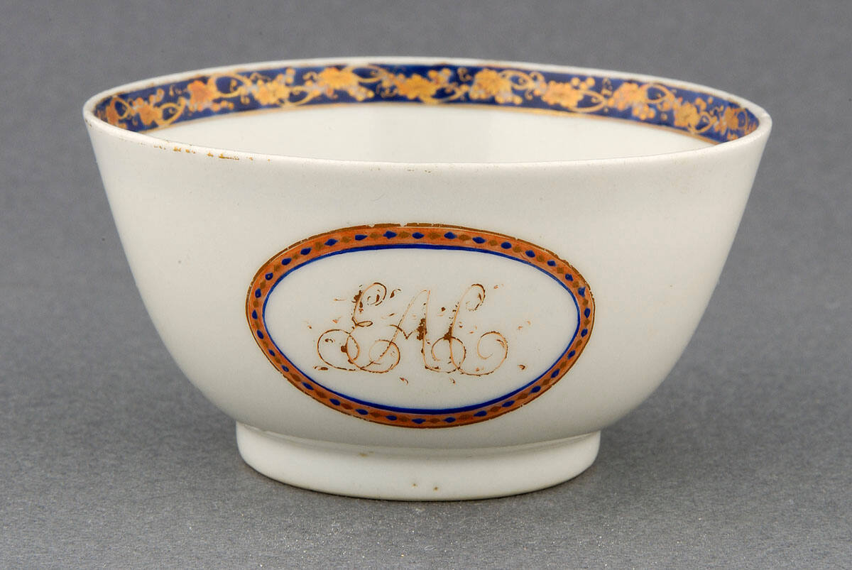 DescriptionNarrow borders, grape pattern in gold on blue. Initials E.H.C. within oval medallion.