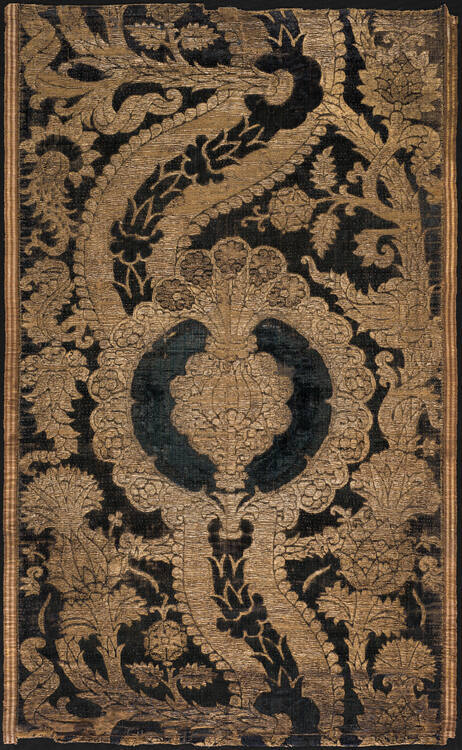 The addition of shimmering gold threads to this textile's swirling pattern of floral and foliate motifs was influenced by Near- and Middle-Eastern weaving processes, the styles and patterns of which set the standard for velvet textiles. European weavers, however, adapted the techniques to their own tastes. The use of metallic thread in fabrics, especially velvet, was popular and signified the patrons' wealth and status. On this panel, threads of finely flattened metal strips, wrapped around a silk core, form the golden expanses and tiny loops.