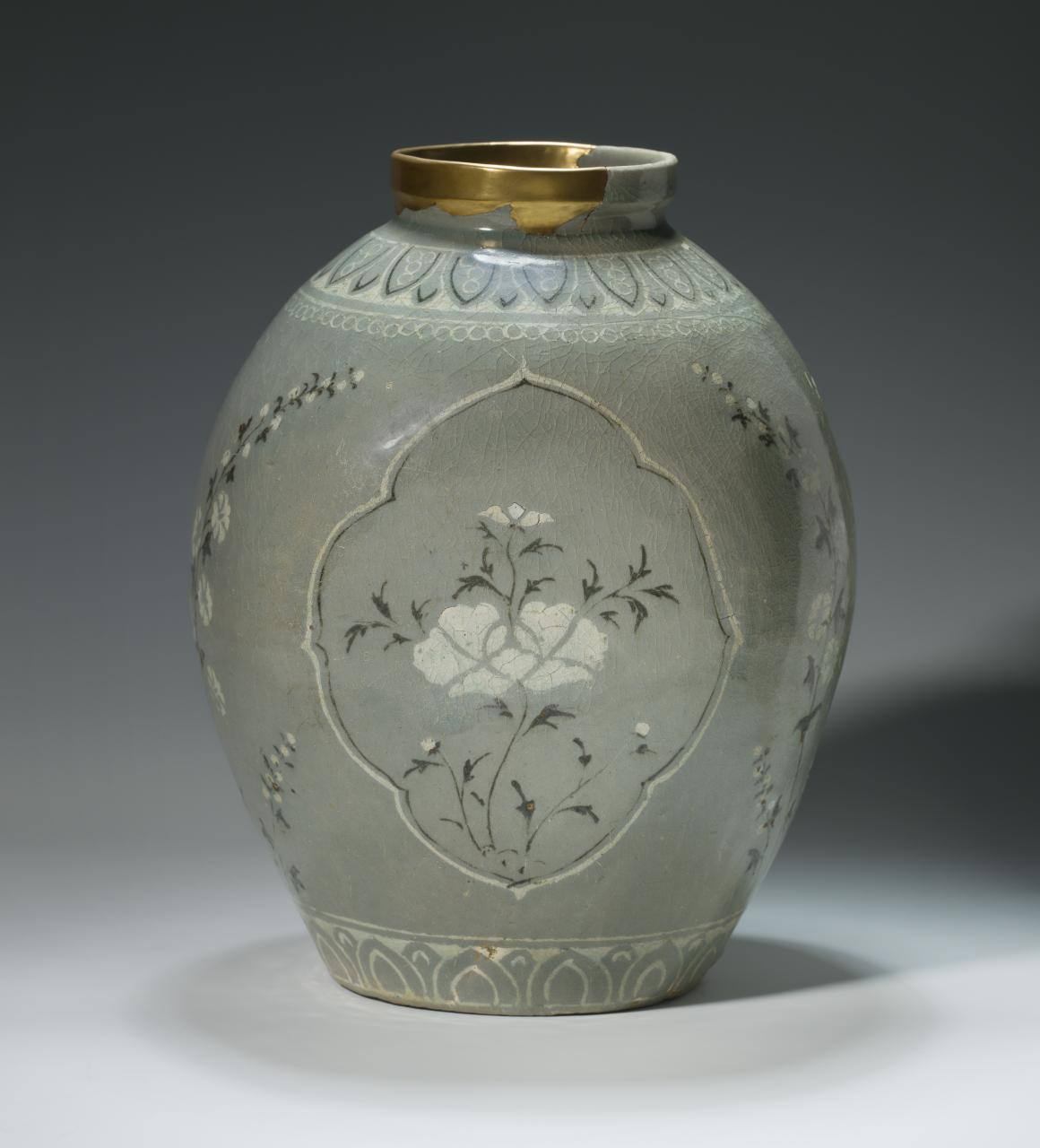 DescriptionLight gray stoneware with decoration of peonies and hollyhocks/mallow flowers in black and white slip under celadon glaze. Ovoid jar with two sides flattened; medallions on flattened sides enclosing peony sprays; other flower sprays on sides, and lotus petal design on neck inlaid with black and white. Grey-green crackled celadon glaze; gold lacquer repari on neck.