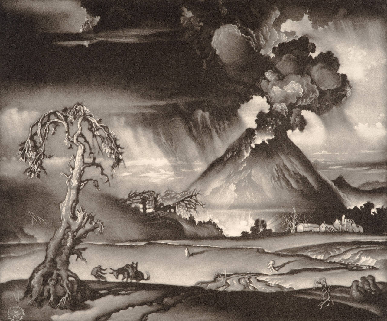 DescriptionExploding volcano in background of landscape scene. In foreground on left side is a gnarled tree, with a figure leading an animal.Copyright© Estate Reynold H. Weidenaar