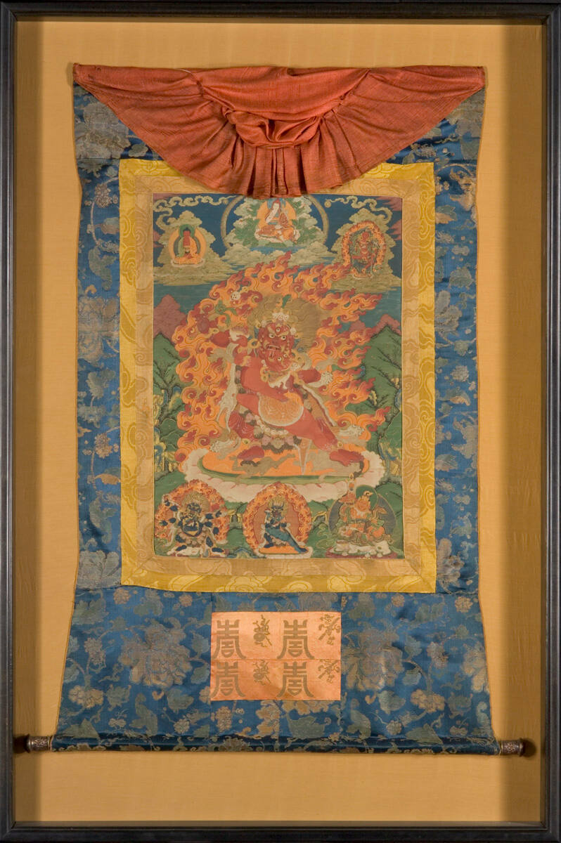 MediumThangka; opaque watercolor and gold on cotton with silk mount and gold brocade (framed)