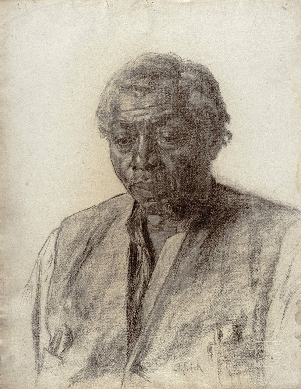 DescriptionThis large charcoal drawing is a bust-length portrait of an elderly black man. The man's body is angled very slightly so that his proper left shoulder is slightly closer to the picture plane than his proper right shoulder. The man turns his gaze downward, rather than looking straight out at the viewer. His face and dark shirt are described in much greater detail than his loose jacket, which is rendered in a more summary fashion.Exhibition HistoryAmerican Art Deco: Designing for the People, 1918-1939, Joslyn Art Museum, Omaha, Nebraska, June 5 2021–September 5 2021; The Nelson-Atkins Museum of Art, Kansas City, Missouri; July 9 2022–January 8 2023, no cat.
