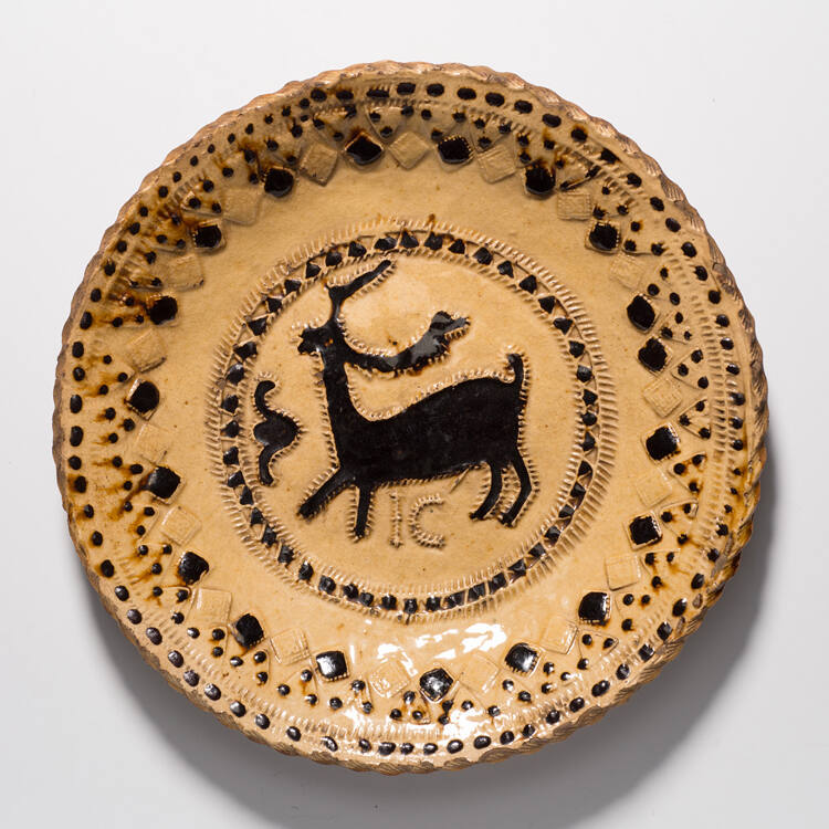 DescriptionCenter decorated in dark brown slip with stag trippant, within raised outline. Notched rim; border bears two rows of lozenge forms. Inscribed in relief beneath stag "IC".