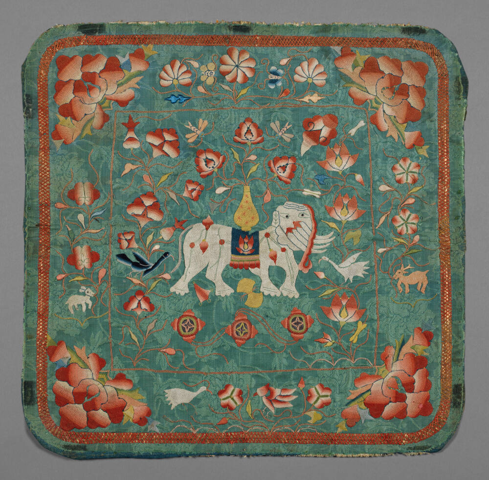 This fragment, embroidered using a technique often used in textiles for Buddhist temples, may have been part of a cushion cover for a sacred space.