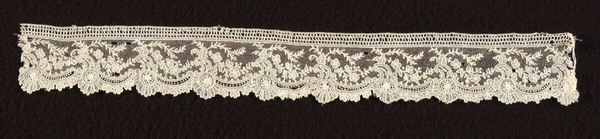 DescriptionNeedle lace of the point de gaze type; fairly simple example in spaced buttonhole stitches and without raised work. Attached to a bobbin-made heading. Shallow scalloped lower edge with delicate floral sprays above.