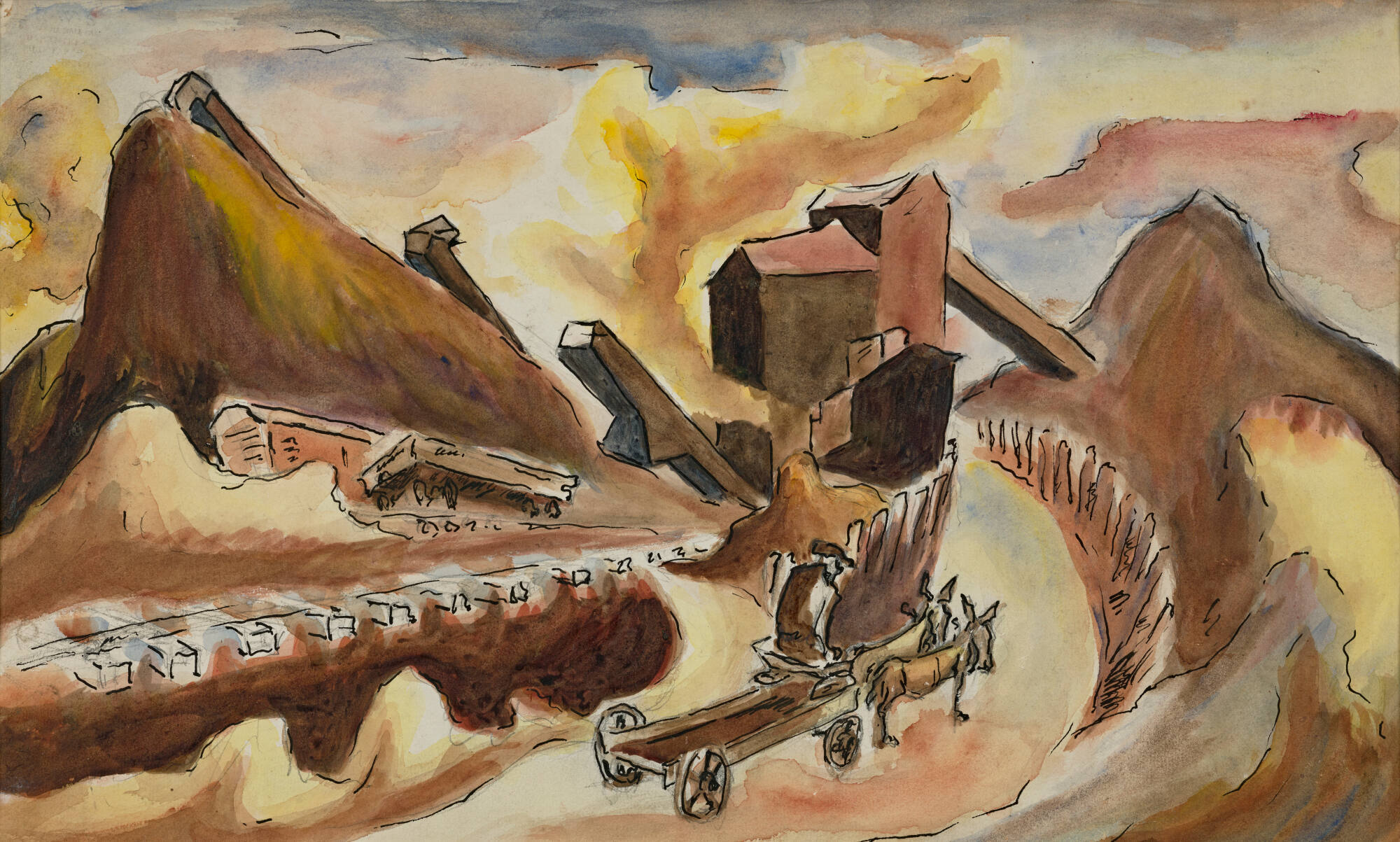 DescriptionIn shades of brown with yellow highlights, mule-drawn wagon at center foreground, on receding path. Railroad track to the left. Two railway cars at foot of hill, left background. Mining structure in center background, with trough leading across road to hill at far right.Copyright© Pollock-Krasner Foundation / Artists Rights Society (ARS), New York