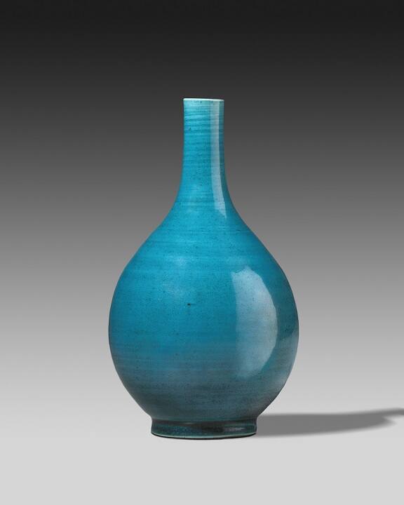 DescriptionSmall pear-shaped vase coated with turquoise blue glaze on fine crackle ware. Slender, straight neck and small foot. With a teakwood stand.ProvenanceYamanaka & Co.;