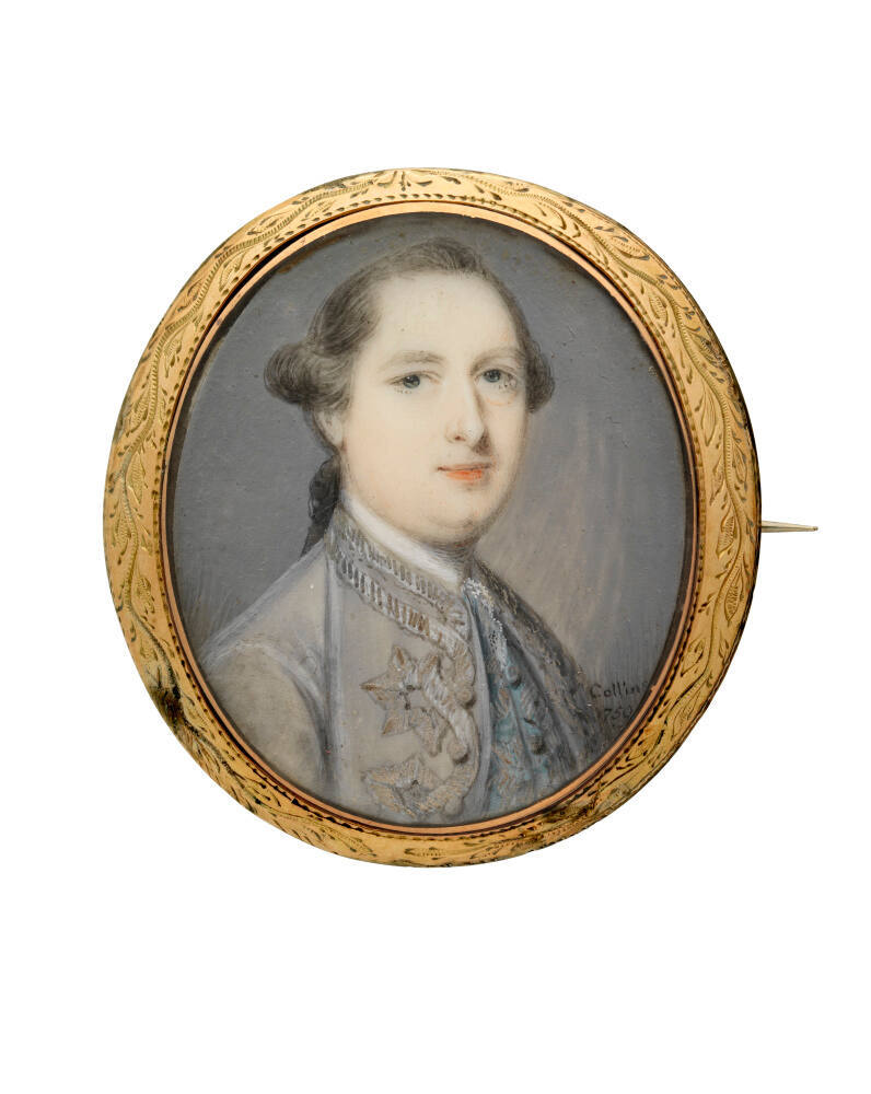[2] According to the lot description, “Samuel Collins. An interesting Miniature of a Man by Samuel Collins, signed in full and dated 1750, with shoulders turned slightly sinister, gaze directed at spectator, wearing a dove-grey coat with silver braid, his hair en queue, against a grey background, 1 3/8 in. This documentary miniature confirms the fact that Collins was a very good miniaturist, and also helps to differentiate between his work and that of Samuel Cotes.” A price list attached to the sales catalogue lists “Hammond” as the buyer.