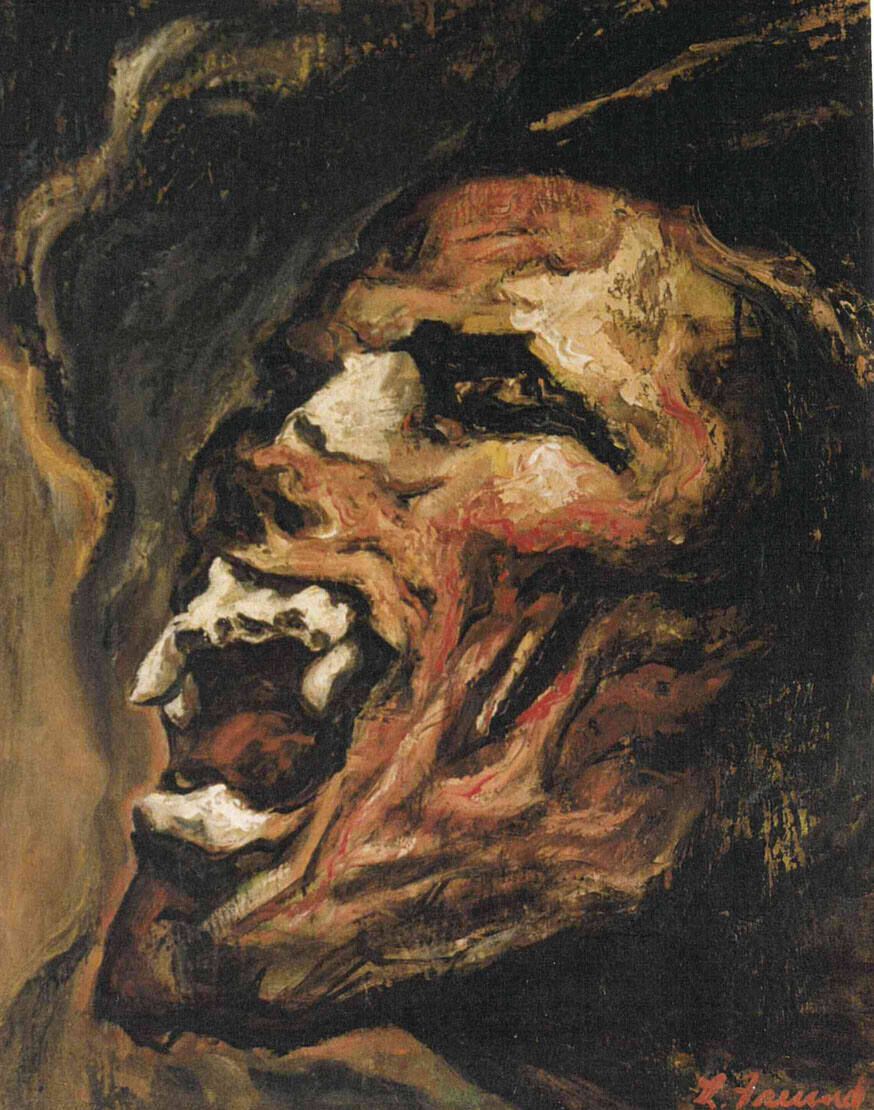 DescriptionExpressively painted head in 3/4 profile facing to left. Open screaming mouth, large teeth, and sunken cheeks. Overall palette is warm - brown, gold, orange, red - with black and white to heighten dramatic chiaroscuro. Anguished, hellish face with distorted undulating facial contours that make the face appear to be melting.Copyright© Louis and Elsie Freund Estate / Jerry Bedford