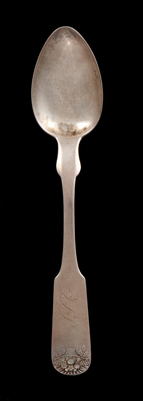 DescriptionFiddle pattern teaspoon decorated at the top of the handle with an embossed basket of flowers and on the back of the bowl with an embossed scallop shell.