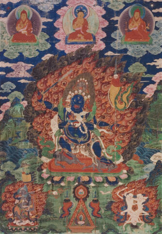 DescriptionThe central figure, surrounded by a fiery mandorla, is blue, with four faces and four hands, carrying a sword, flag, chopper and skull. The lower left arm cradles a flask against his chest. He stands in pratyalidha upon two persons. An unidentified teacher is at the upper left, Nagarjuna at upper center, and Atisha at upper right. At lower left is Mahakala as Bram-zehi, with a long gray beard and blowing on a bone trumpet. Lower right: Citipati.Exhibition HistorySiamese and Tibetan Paintings and Bronzes, Norfolk Society of Arts, VA, November 7–28, 1948, no. 36 as Blue figure of Mahakala surrounded by red and black flames holds a sword and a skull.
