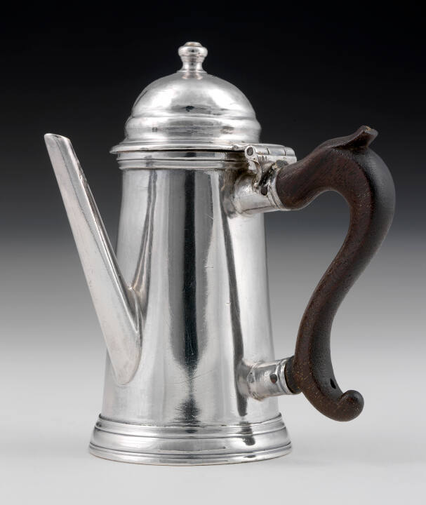 DescriptionMiniature silver coffee pot with a tapered body, lighthouse form cover, wood side handle, and straight spout. Engraved with a large lion crest (George III) on one side.Gallery Label