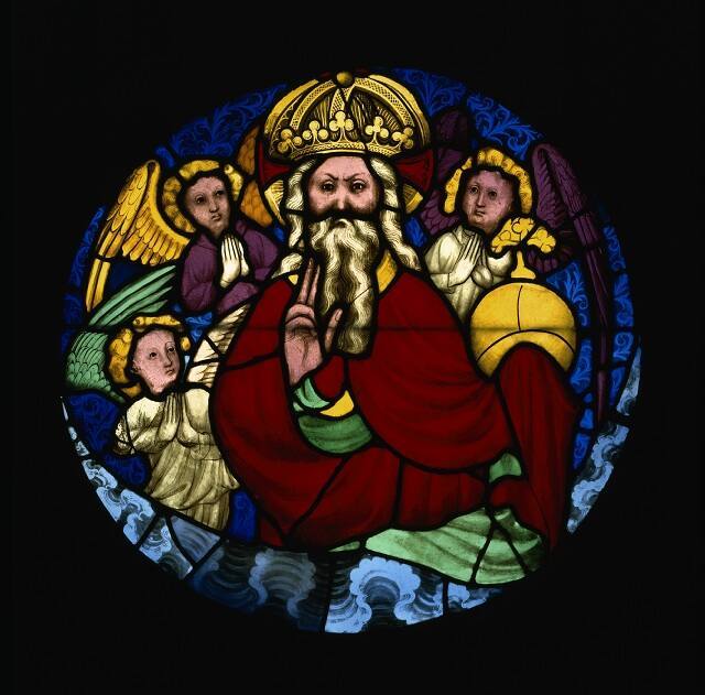 Like paintings of the period, 15th-century stained-glass windows assumed many sizes and shapes. One of the most common shapes for religious subjects was the roundel. This example shows God the Father floating among clouds in the company of three angels. He raises two fingers of his right hand in a gesture of blessing, and in his left hand he holds an orb, symbolic of his sovereignty over the world. This window represents a transitional period in the art of stained glass, during which smaller, individual pieces of glass ceased to form the design of the window: the design was achieved by applying painted details onto larger pieces of glass.
