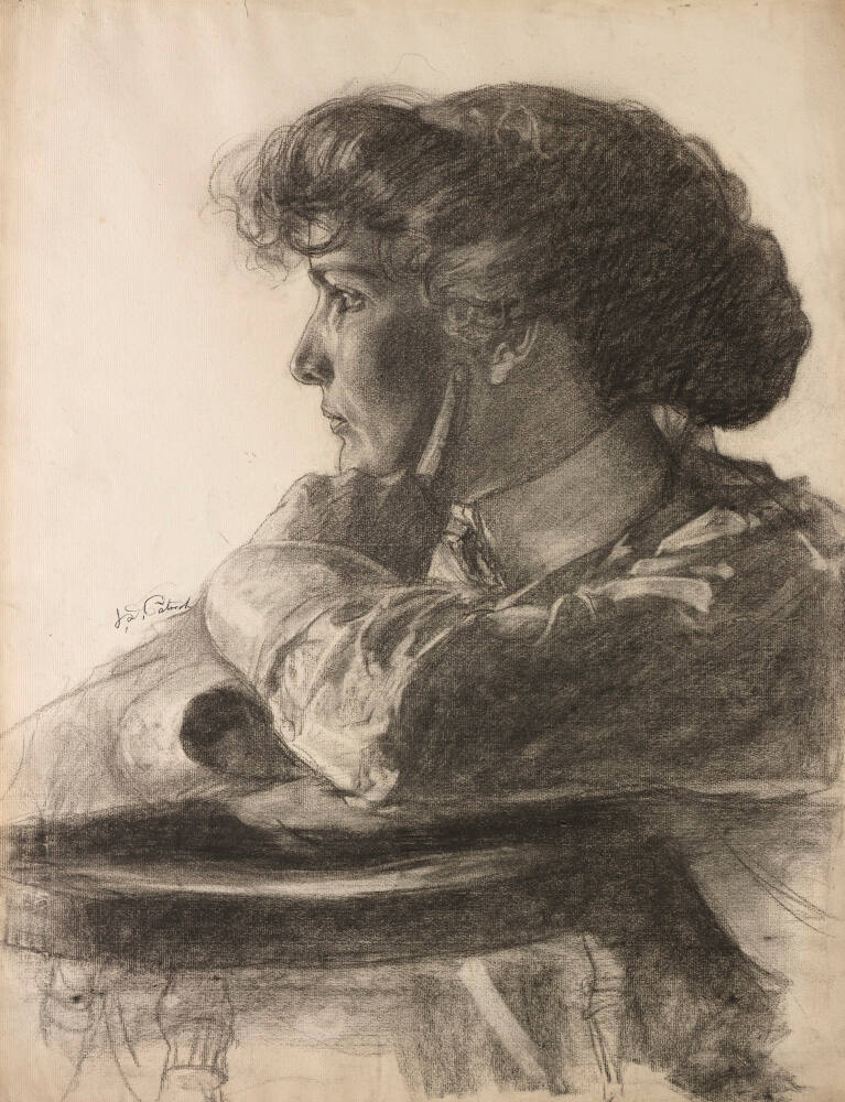 DescriptionThis large charcoal drawing is a profile portrait of a young woman who appears to be leaning with her arms folded over the back of a chair or table top. The woman's head is turned so that the viewer may only see the proper left side of her face. The index finger of her proper left hand touches her cheek near her ear while her chin rests on the knuckles of this same hand. The woman's hair is loosely arranged in a fashionable bouffant. She wears a long-sleeved blouse with a high collar to which a large brooch is pinned. The woman's hair, face, collar, brooch, and proper left sleeve are much more detailed than her proper right sleeve and the chair or table top on which she leans.