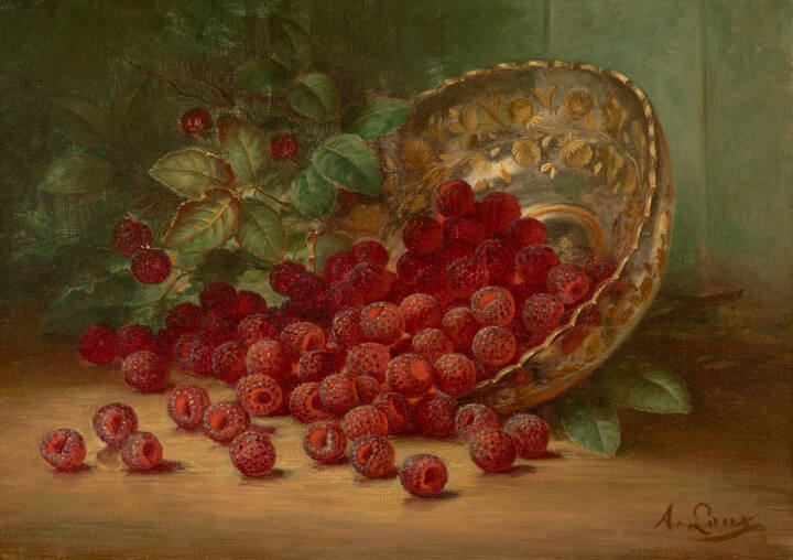 DescriptionThis painting provides a close-up view of finely rendered rasberries, which spill from a tipped bowl. The background is predominately green with the suggestion of foliage throughout the left hand side.Published References“Museum Receives 19th- and 20th-Century American Works,”
