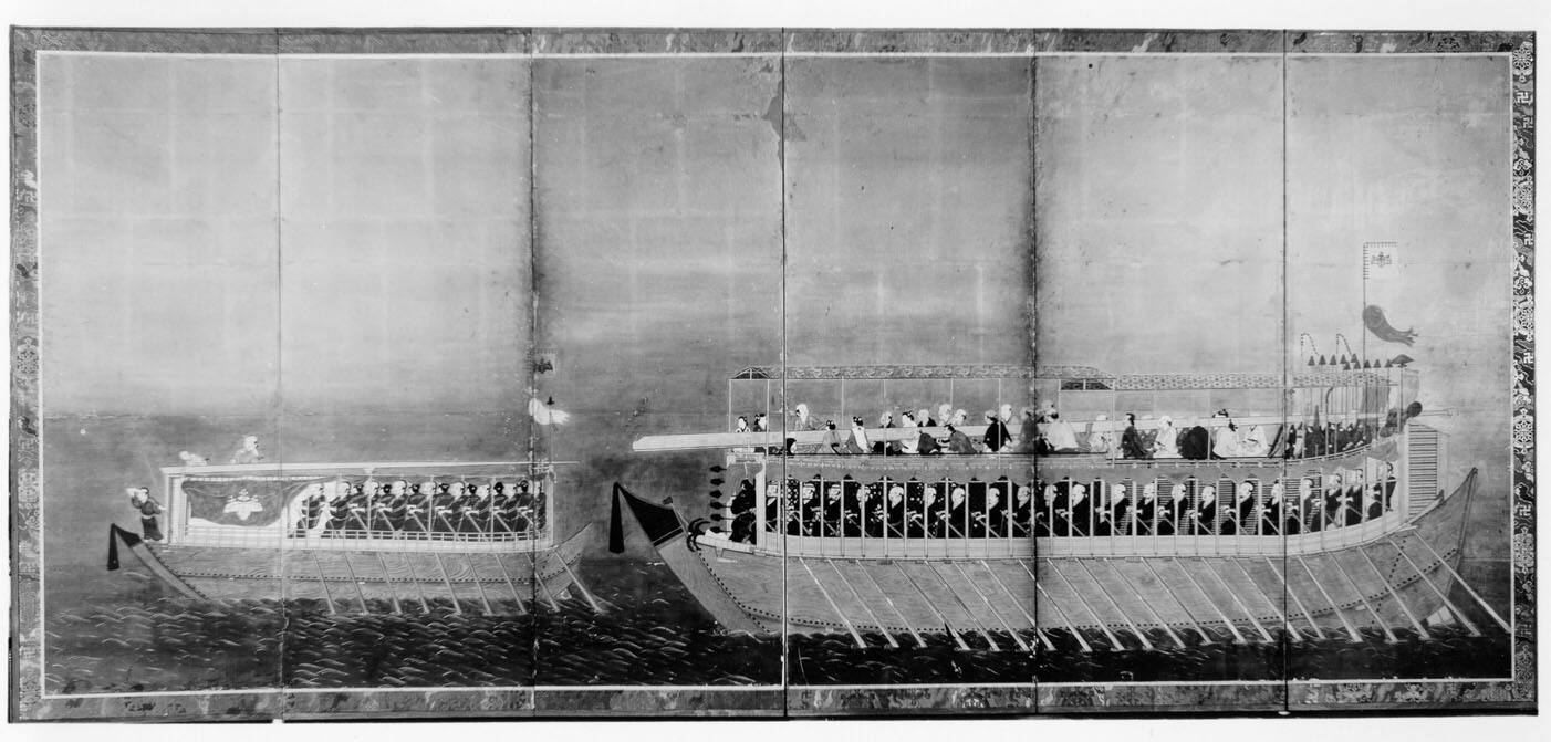 A Daimyo and His Retainers in Barges