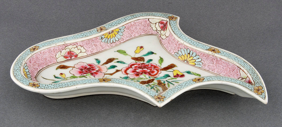 DescriptionOne of a pair of famille rose dishes, irregular shape, curved and pointed. Reddish pink peonies with pink and blue borders.