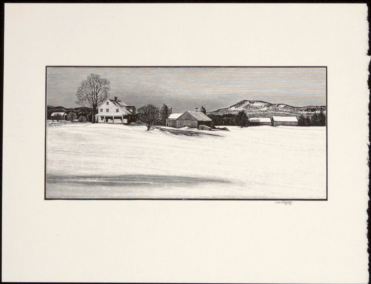 DescriptionFarm landscape with house, barn, trees, and other buildings at horizon. In background is a mountain (right) and the foreground is flat ground.Copyright© Estate of Asa Cheffetz