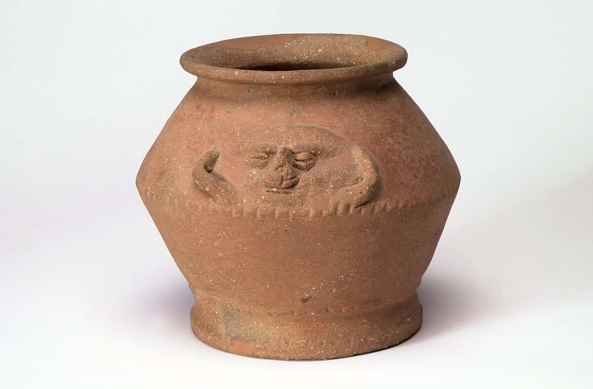DescriptionJar with annular base and human face in relief, red wareProvenanceFound in Colombia by Gregory Mason, 1931 [1];