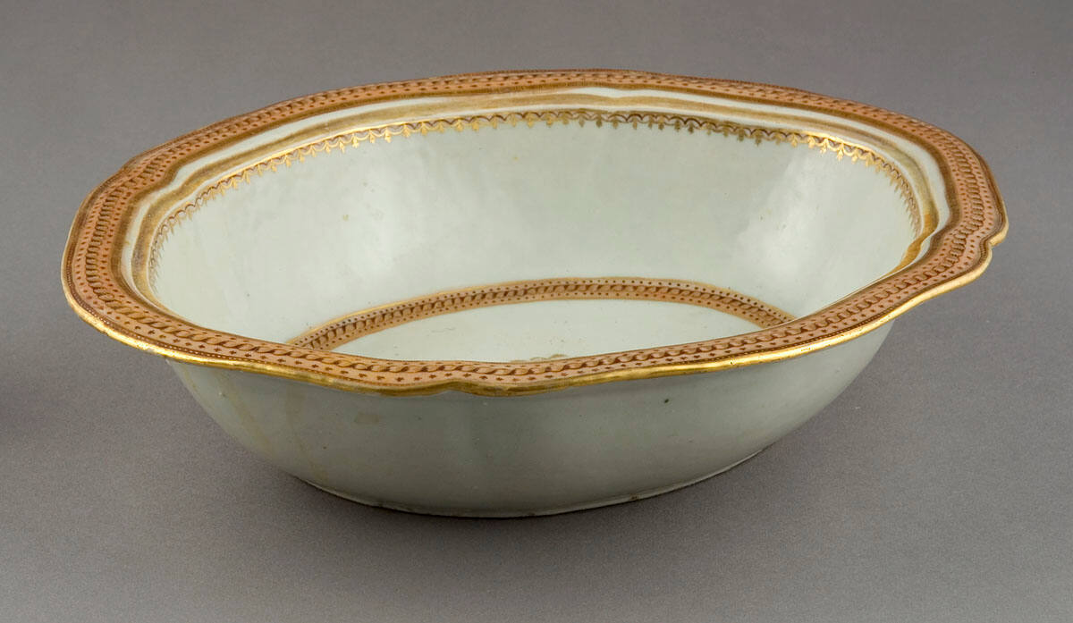 DescriptionHas lid. Orange and sepia borders. Oval medallion with initials erased.